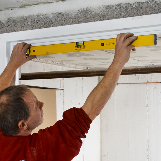Völlig unabhängig von der Art der Zargenhinterfüllung erfolgen die Montage und Feinjustierung von Türblatt, Drückergarnitur, Dichtungsprofil sowie sonstigem Zubehör wie beispielsweise einem Obentür- oder Panikschließer auf gewohnte Weise.