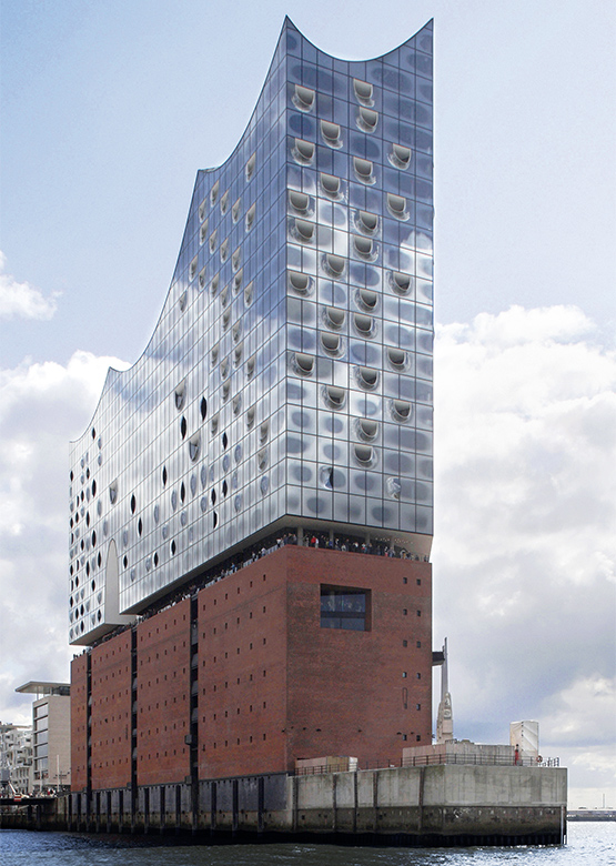 Die Strahlkraft der Elbphilharmonie lässt es schnell vergessen, aber bei diesem Bauwerk handelt es sich um eine sehr umfangreiche Altbausanierung. Der ursprüngliche Kaiserspeicher bildet nun den 37 m hohen Sockel, auf dem die markante, von dem Basler Architekturbüro Herzog & de Meuron entworfene Dachlandschaft aus Glas und Stahl sitzt. Mit ihr wuchs die verfügbare Nutzfläche auf 120.000 m2 an, die sich natürlich auf weit mehr als den Konzertsaal und die dazugehörige Peripherie verteilt. Zur Elbphilharmonie gehören auch ein 5-Sterne-Hotel mit 244 Betten und an seiner Westspitze 45 exklusive Eigentumswohnungen, die sich über 17 Etagen verteilen.