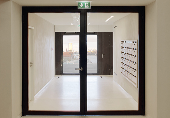 Während die Edelstahl-Brandschutztüren dem Foyer vorbehalten sind, finden sich in den Wohnungsebenen im Übergang der Aufzugsvorräume zu den Erschließungsfluren schwarz lackierte Rohrrahmentüren.